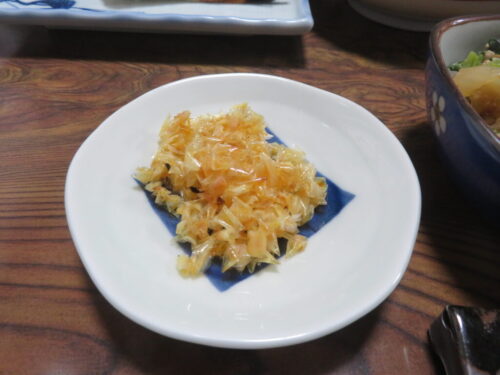 こちらがおつまみのように食べられる.タイのうろこを揚げたものです.