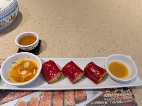 見た目は赤色ですが、着色で辛いわけではないです。中にはぷりぷりのエビが入っていてこれは絶品です。日本では食べられない味~