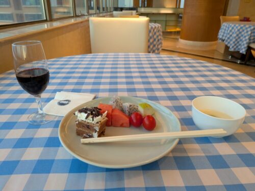 期待していなかったのですが、ホットミールも数種類、フルーツ、サラダ、デザート、アルコールはワインやビールもあって、なかなかの充実具合で驚きました。